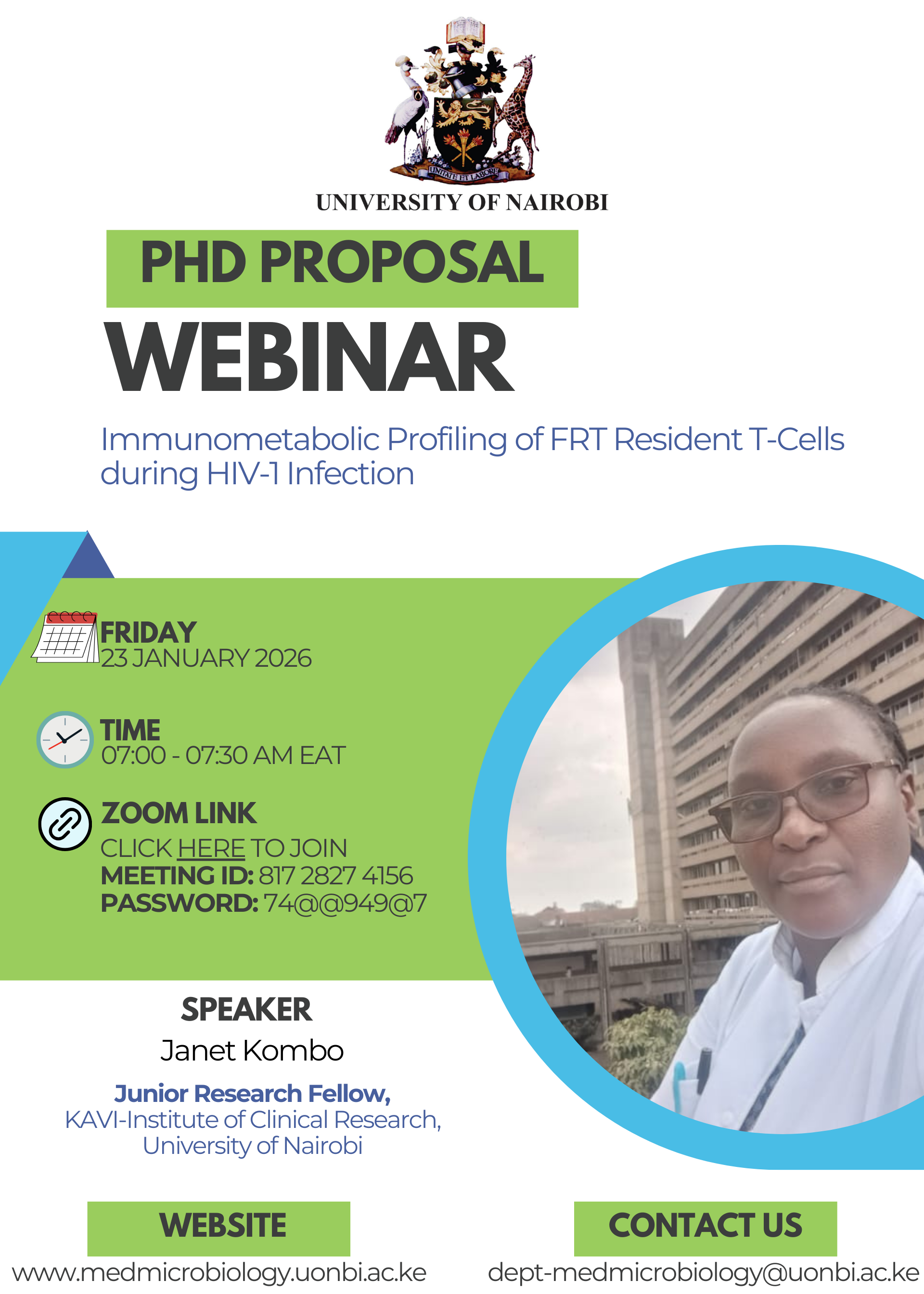 Join us for a PhD Proposal Presentation on Immunometabolic Profiling of FRT Resident T-Cells during HIV-1 Infection by Janet Kombo.
